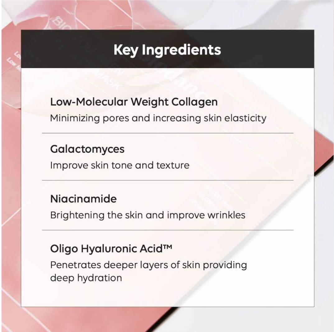 Infused with ultra-low molecular collagen, this mask is a game-changer for pores and elasticity. It effortlessly refines enlarged pores, boosts skin elasticity instantly, and visibly smooths fine lines and wrinkles.